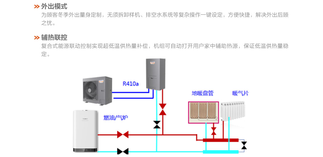 采用直流變頻技術,制熱量范圍8.5~16kW,穩(wěn)定運行環(huán)境溫度范圍-20℃~28℃、出水溫度范圍25~55℃,具有低溫強熱、節(jié)能高效、穩(wěn)定可靠等特點,適用于集中供暖覆蓋不足的農(nóng)村及城郊地區(qū)以及城市獨立供暖的公寓、復式樓、別墅、單元寫字樓、餐廳、商店、娛樂場所等空間.