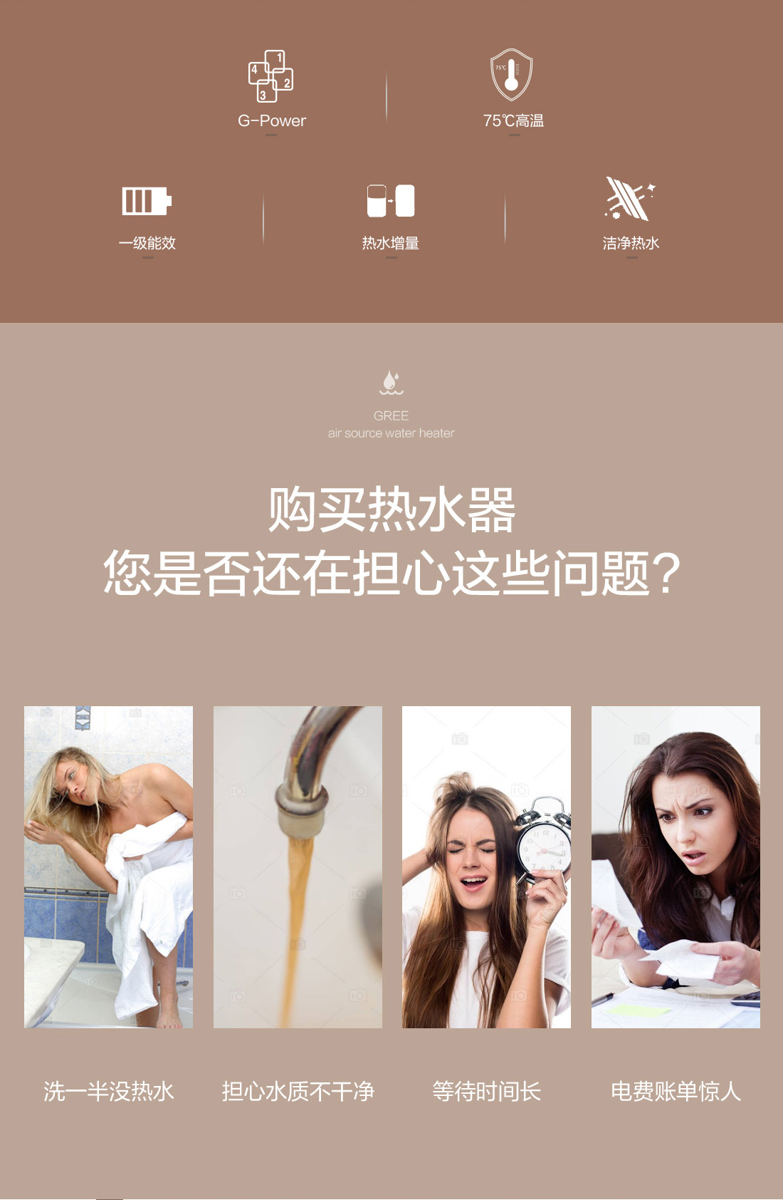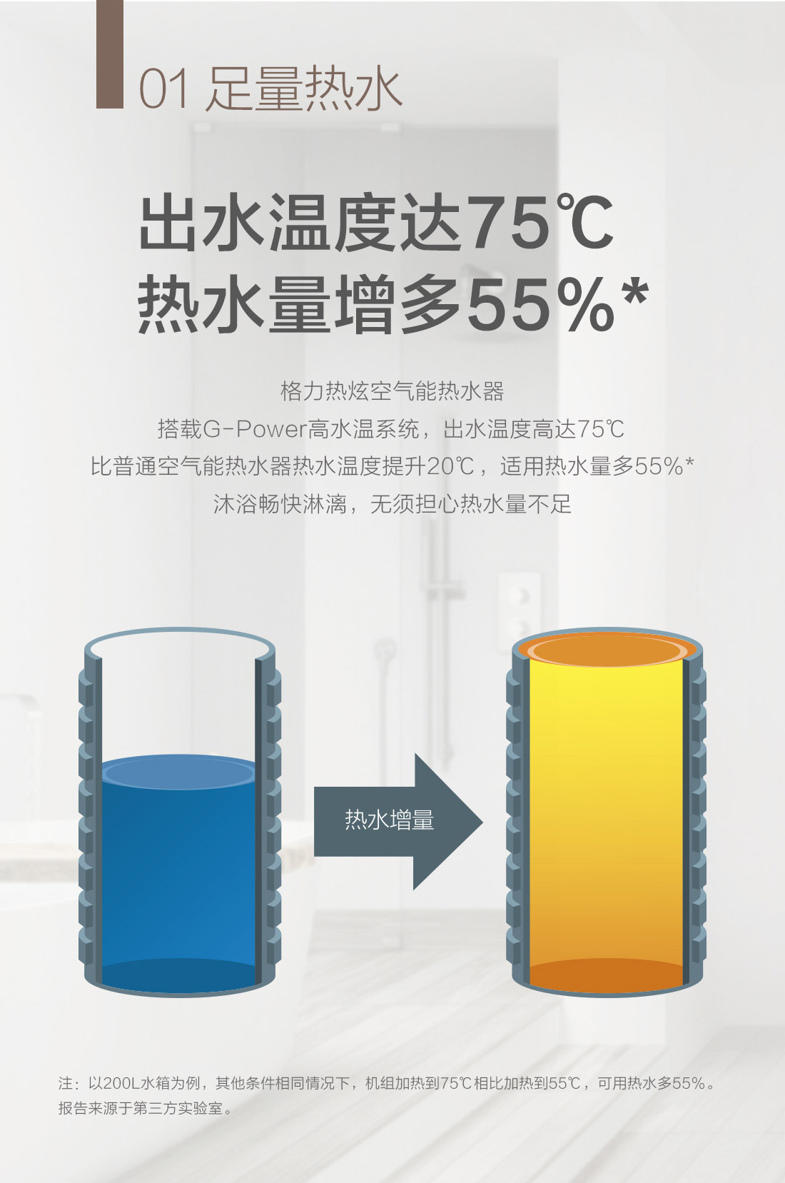 高溫大水量,沐浴暢快享,搭載G-power高水溫系統,成就水溫更高,水量更大的空氣能熱水器,更達1級能效,省電高達75%,全家人暢快享受的沐浴選擇。